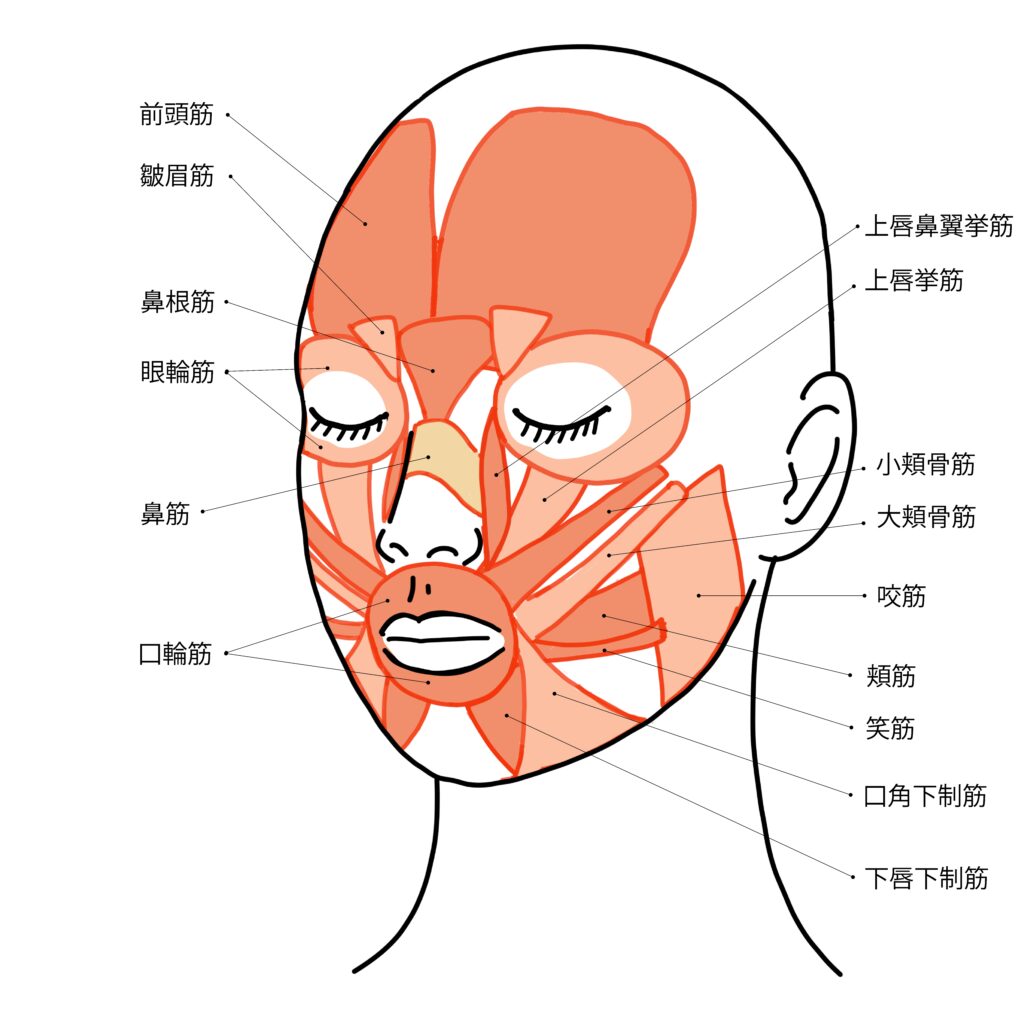 いろんな表情をつくるために、口角や頬、目元、額、様々な場所についている筋肉たち。